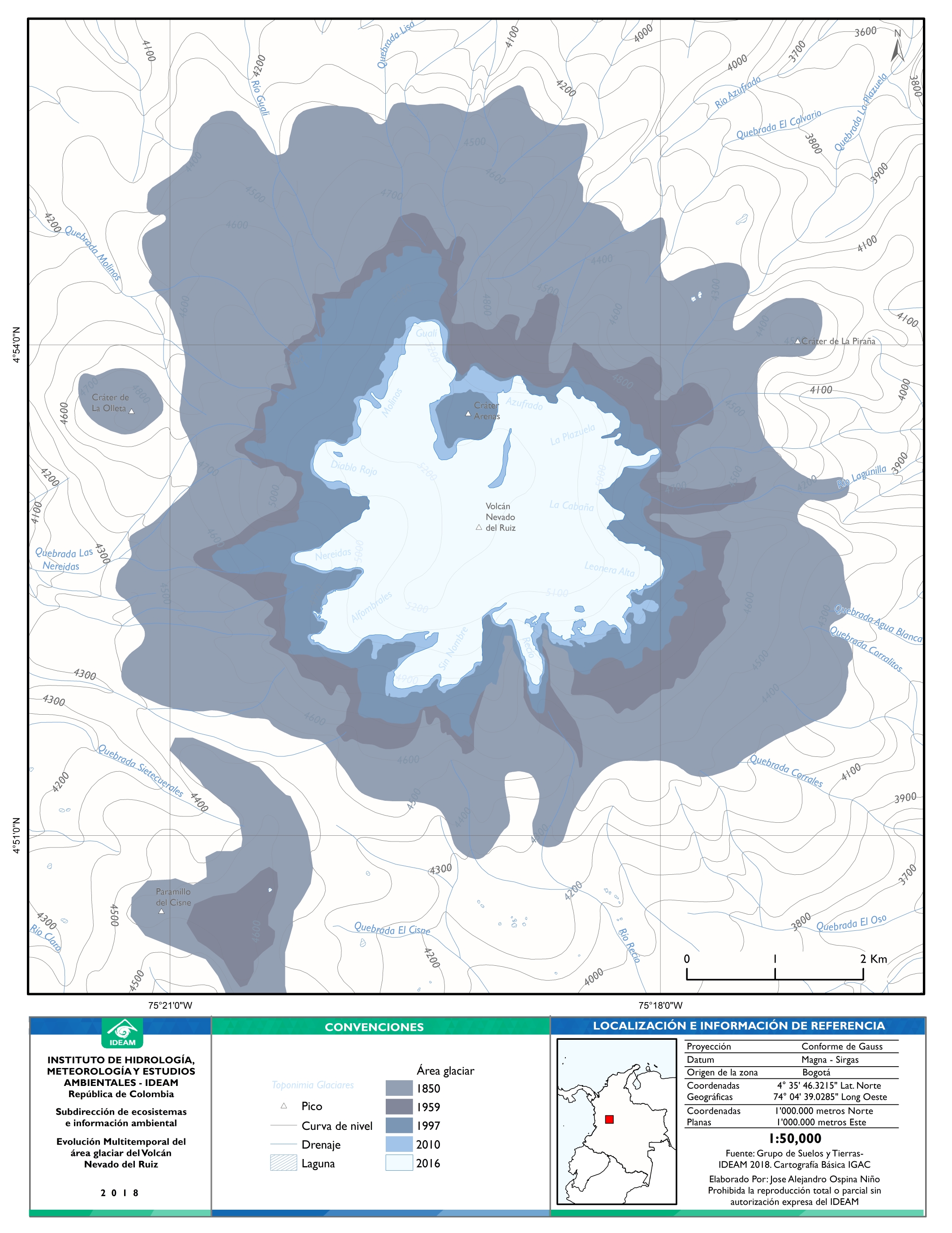 Description: Map of the Nevado del Ruiz from the National Institute on Hydrology, Meteorology and Environmental Studies (IDEAM). Different color shadings show the evolution of the glacier through the years: 1850, 1959, 1997, 2010, and 2016.